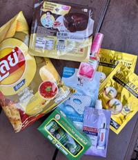 Some of the writer’s store finds, including hot chili squid chips and beauty products.
